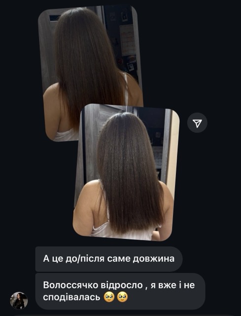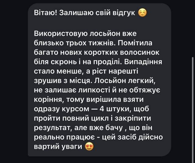 За місяць використання бачу, що не лише з’явились нові волосинки, а й загальна довжина пішла в ріст швидше, ніж зазвичай. Волосся виглядає більш щільним, особливо в зоні чубчика, де завжди було дуже рідко. Саме тому вирішила взяти лосьйони курсом, щоб продовжити ріст і закріпити результат.