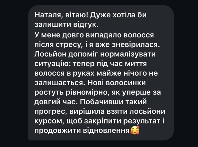 У мене довго випадало волосся після стресу, і я вже зневірилася. Лосьйони допомогли нормалізувати ситуацію: тепер під час миття волосся в руках майже нічого не залишається. Нові волосинки ростуть рівномірно, як уперше за довгий час.