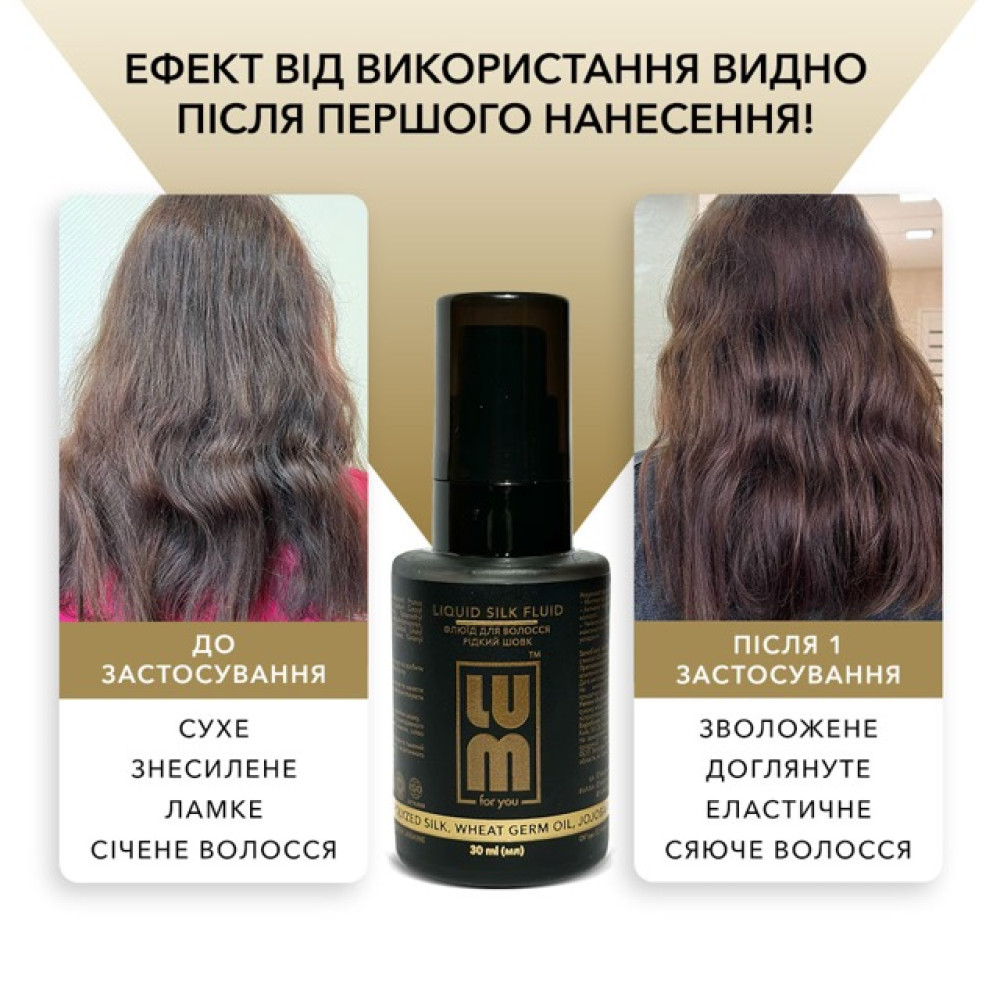 - - Перед використанням LUM Liquid Silk Fluid вимити волосся та зробити укладку за допомогою LUM Keratin Protective Spray.