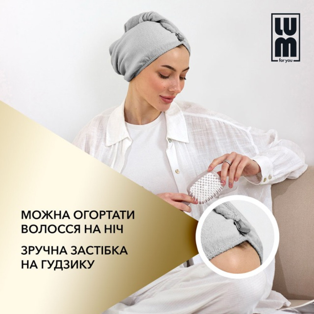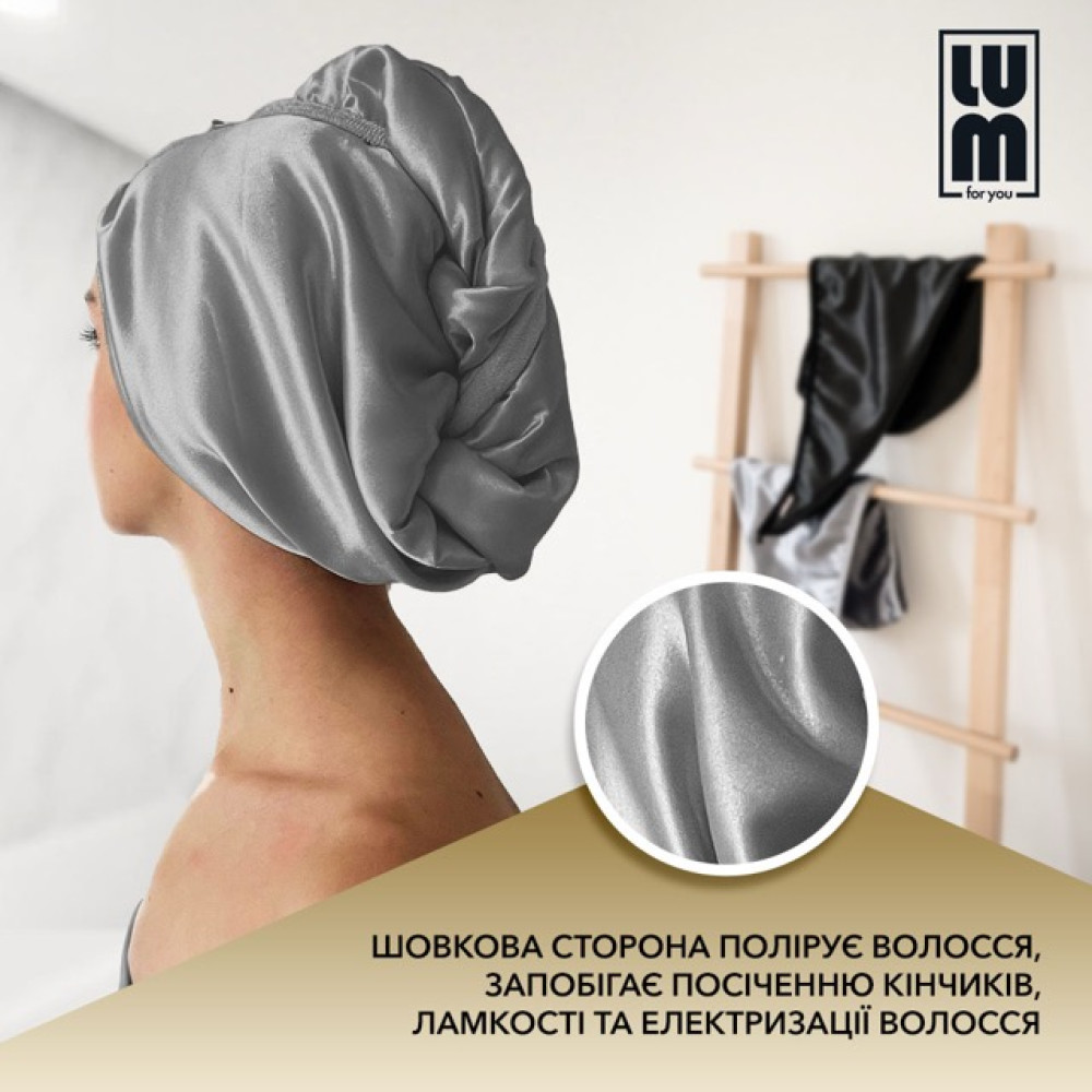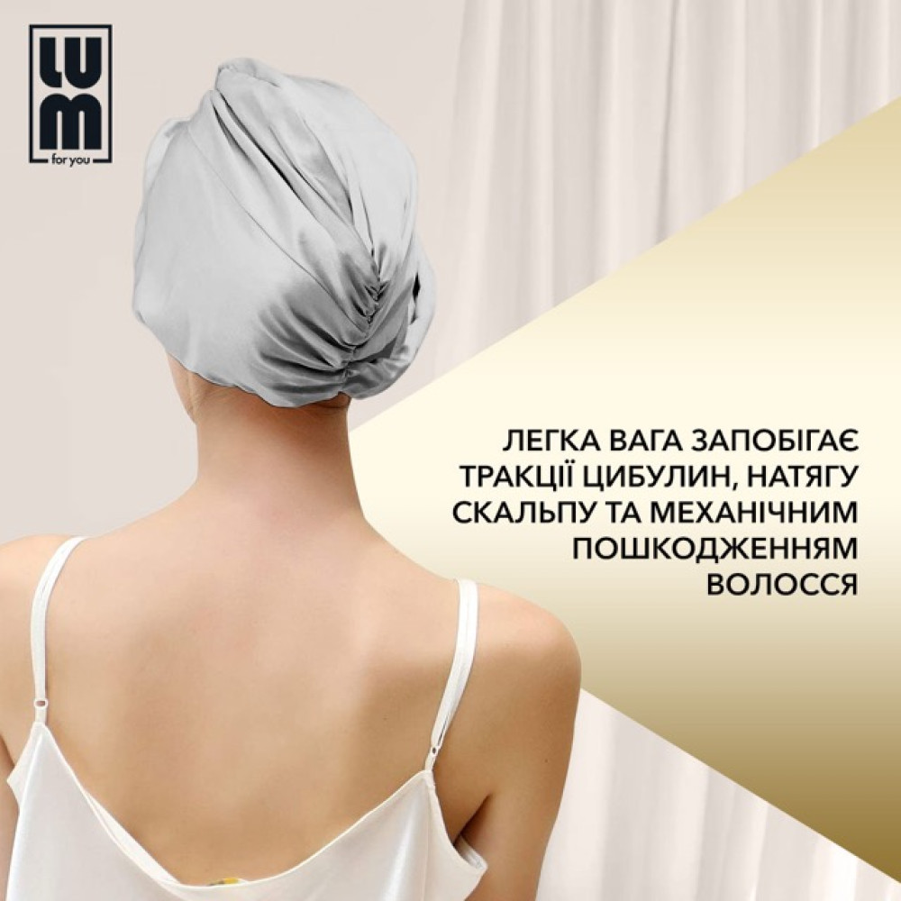 Двосторонній LUM Тюрбан - повертає об'єм біля самих коренів волосся, надає зачісці природної пишності. Не перерозтягує м'яз, що утримує волосяний фолікул, і дбайливо вбирає вологу, що забезпечує оптимальний догляд. Зроблено з чистого шовку - матеріалу з високою гігроскопічністю та протеїнами. Забезпечує терморегуляцію, дає змогу шкірі дихати та полірує волосся, що запобігає його сплутуванню. Тюрбан ефективно вбирає вологу, запобігає пересушуванню волосся. Легкий та зручний тюрбан не рве волосся, а сприяє збільшенню його об'єму.